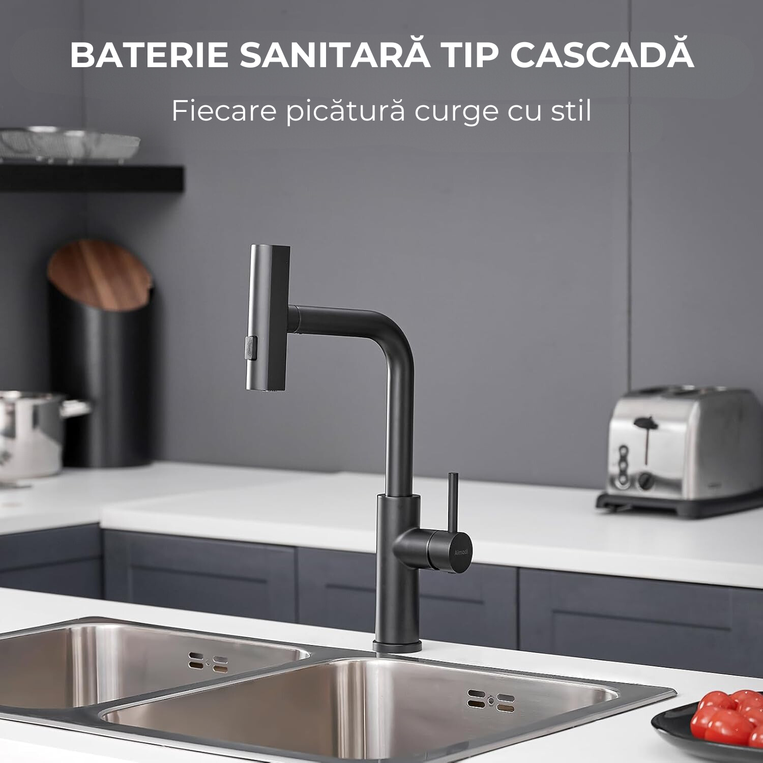 Baterie sanitară bucătărie 360° – 3 tipuri de jet, cap pivotant, negru mat, design inovator
